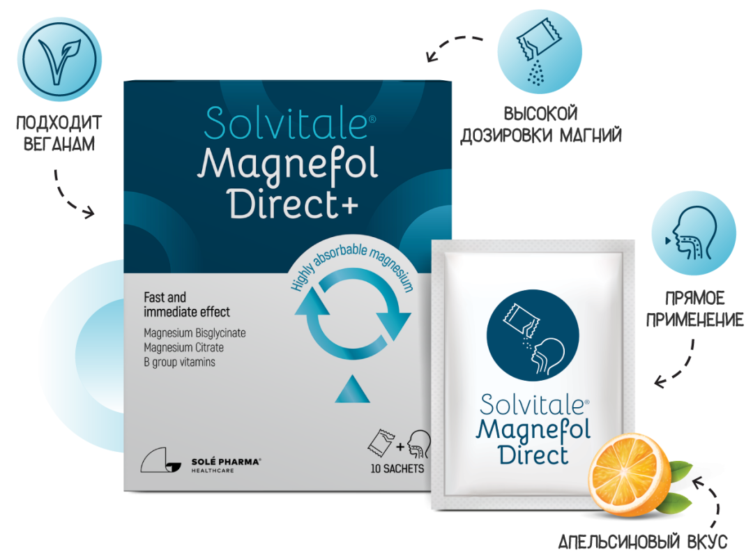 Solvitale® Magnefol Direct+ — первая формула магния бисглицината и магния цитрата в формате стик-саше со свежим апельсиновым вкусом. Каждый саше содержит высокую дозу элементарного магния.